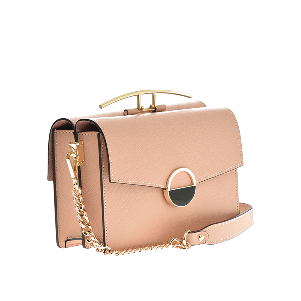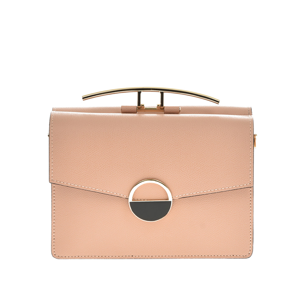 Outer: 100% LeatherOne top handleTop flap over with magnetic button closureTwo slip interior pocketsShoulder strap, length 123 cm